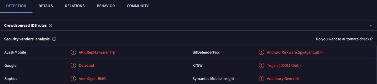 Salah satu contoh aplikasi nonton gratis yang teridentifikasi berbahaya adalah xyz.play.iptvlite. Berdasarkan analisis dari Virus Total, aplikasi ini terdeteksi sebagai malware, trojan, dan spyware oleh beberapa vendor keamanan.